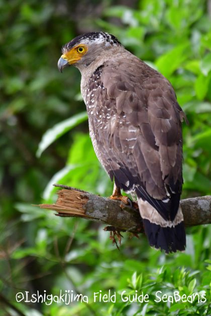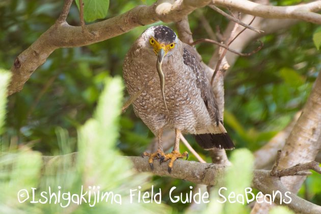 サキシマアオヘビを何処かで捕獲して、目の前の枝に飛んできたカンムリワシ。